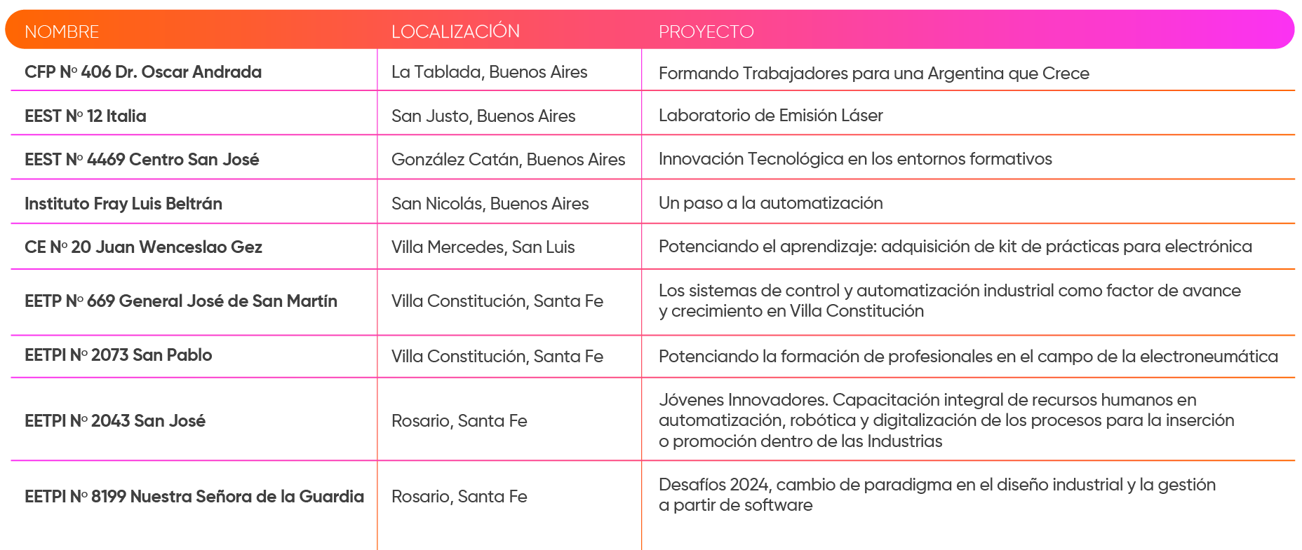 En Rosario, la escuela técnica N° 2043 San José presentó un proyecto de equipamiento para la automatización y robótica, para incorporarlo a la capacitación de sus estudiantes de la carrera Técnico en Informática. La institución pretende, a su vez, desarrollar cursos de capacitación que permitan mejorar la cualificación del personal de industrias que están buscando optimizar sus procesos, y de personas subocupadas o desocupadas que deseen introducirse en el sector de programación. En otro proyecto,la escuela técnica Nº 8199 Nuestra Señora de la Guardia incorporará PCs para utilizar software de diseño mecánico y ofrecerá capacitaciones en el campo del diseño y mecanizado mecánico, con su posterior aplicación en la fabricación de piezas.